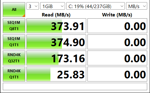 A benchmark test of the in-use system drive C: (left picture) didn’t show a significant performance gain in comparison to the test I did 3 months ago without “Native NVMe Disk Drive Support” (right picture):