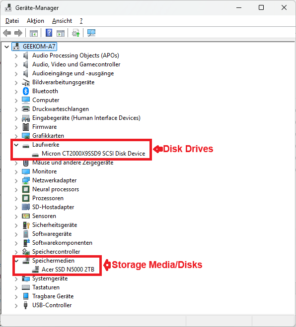 The Device Manager of the AMD X570 chipset PC didn’t show the “Storage Media/Disks” section at all, not even after having run the recommended Registry tweaks. Both attached NVMe SSDs were still listed within the “Disk Drives” section: