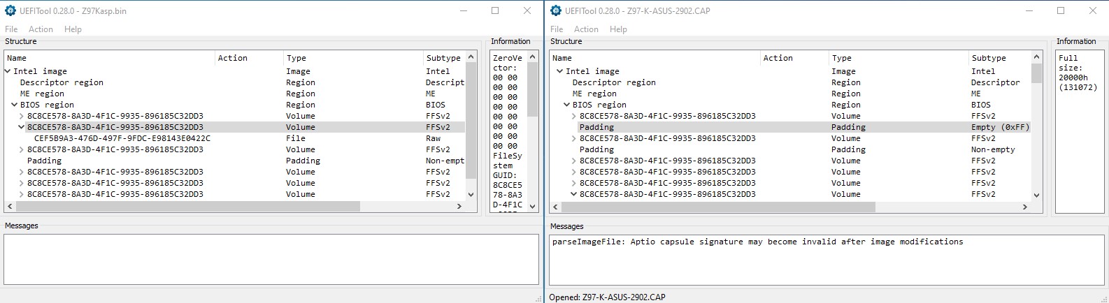 I noticed the bios backup made with the programmer, the bios region has a different line (a string) than the .cap (says Padding) bios from Asus website.